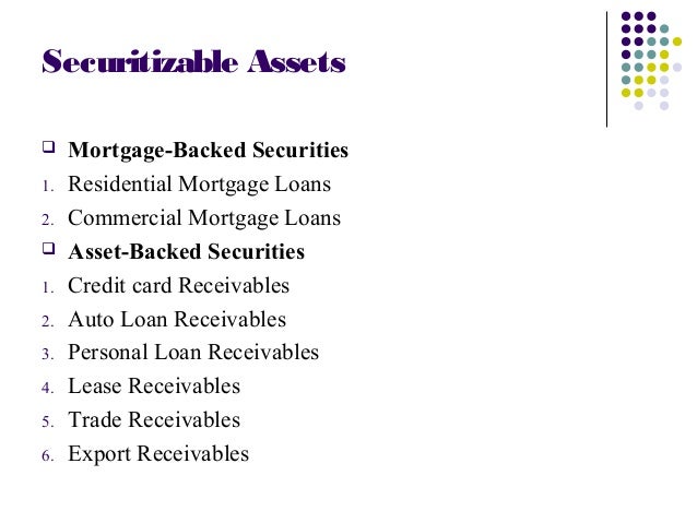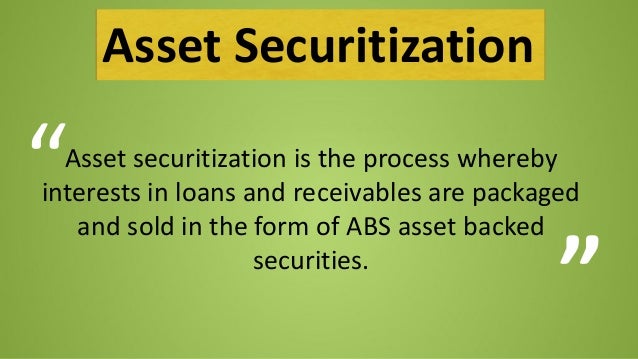 Asset-Backed Securitization Asset securitization is the process by which loans or other credit exposures are pooled and credit card and auto receivables, residential first mortgages, asset-backed securities offer a collateralized security that generally has a good return with ... Visit Document